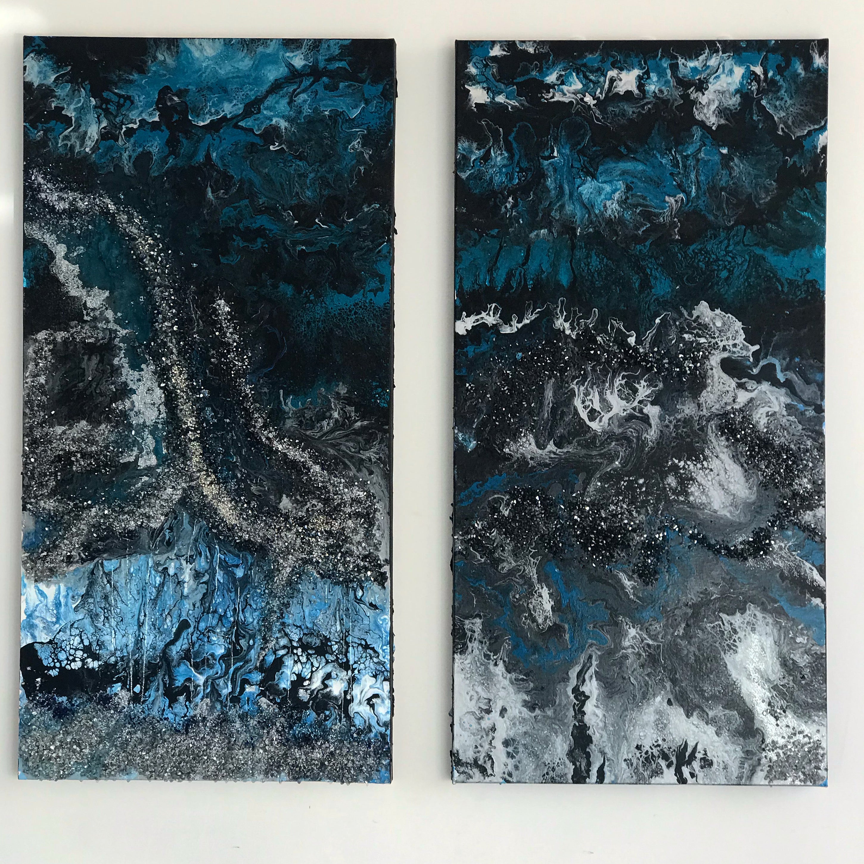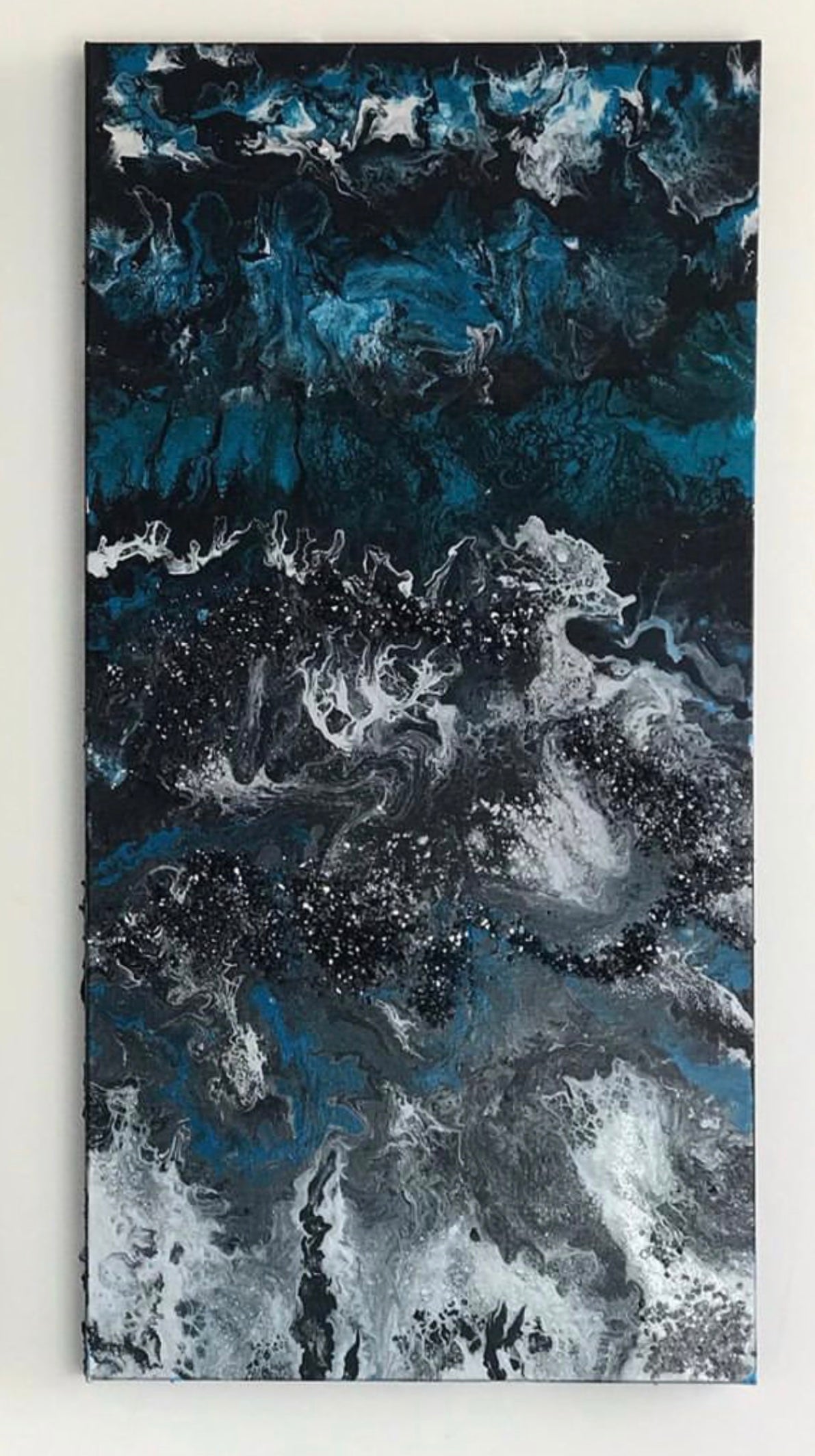 Hand-painted with rushed glass in multiple colours spread onto the canvas. A unique timeless piece with a modern twist.